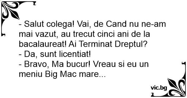 - Salut colega! Vai, de Cand nu ne-am mai vazut, au trecut cinci ani de la bacalaureat! Ai Terminat Dreptul?