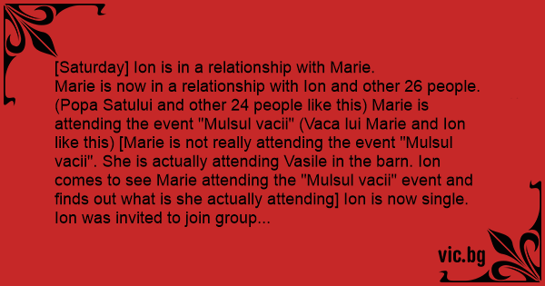 Marie is now in a relationship with Ion and other 26 people. (Popa Satului and other 24 people like this) Marie is attending the event "Mulsul vacii" (Vаса lui Marie and Ion like this) [Marie is not really attending the event "Mulsul vacii". She is actually attending Vasile in the barn. Ion comes to see Marie attending the "Mulsul vacii" event and finds out what is she actually attending] Ion is now single.