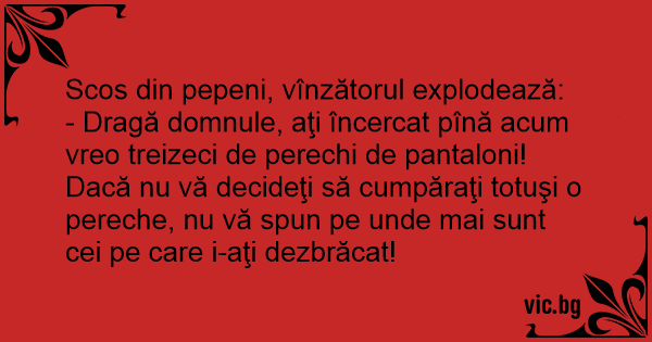 - Dragă domnule, aţi încercat pînă acum vreo treizeci de perechi de pantaloni! Dacă nu vă decideţi să cumpăraţi totuşi o pereche, nu vă spun pe unde mai sunt cei pe care i-aţi dezbrăcat!