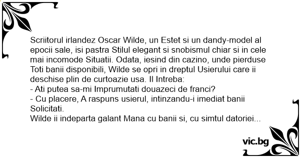 Scriitorul irlandez Oscar Wilde, un Estet si un dandy-model al epocii sale, isi pastra Stilul elegant si snobismul chiar si in cele mai incomode Situatii. Odata, iesind din cazino, unde pierduse Toti banii disponibili, Wilde se opri in dreptul Usierului care ii deschise plin de curtoazie usa. Il Intreba: