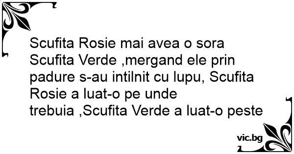 Scufita Rosie mai avea o sora Scufita Verde ,mergand ele prin padure s-au intilnit cu lupu, Scufita Rosie a luat-o pe unde trebuia ,Scufita Verde a luat-o peste tot!