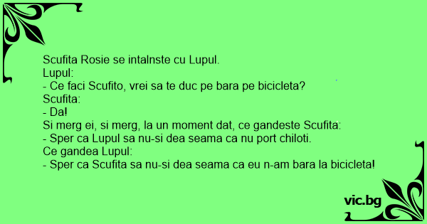 - Sper ca Scufita sa nu-si dea seama ca eu n-am bara la bicicleta!