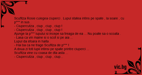 Scufitza Rosie culegea ciuperci . Lupul statea intins pe spate , la soare , cu p*** in sus .
