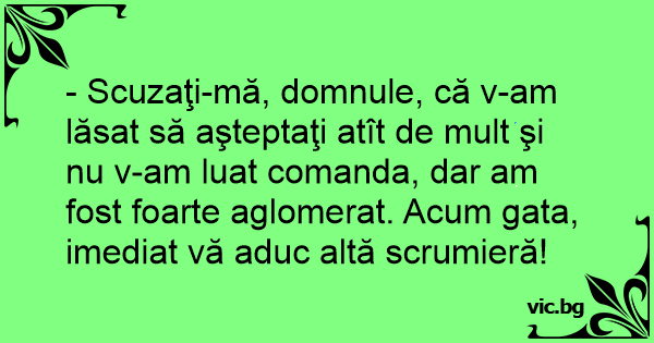 - Scuzaţi-mă, domnule, că v-am lăsat să aşteptaţi atît de mult şi nu v-am luat comanda, dar am fost foarte aglomerat. Acum gata, imediat vă aduc altă scrumieră!