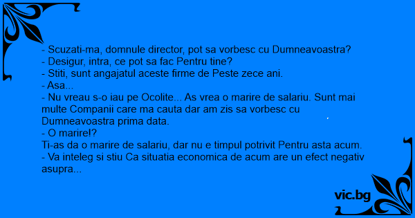 - Nu vreau s-o iau pe Ocolite... As vrea o marire de salariu. Sunt mai multe Companii care ma cauta dar am zis sa vorbesc cu Dumneavoastra prima data.