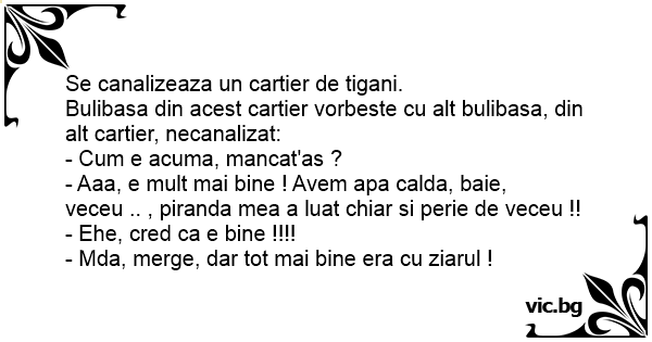 Se introduce canalizarea într-un cartier de ţigani. Ilie îi povestea cumătrului său: - Piranda mea a luat şi perie la WC! - Şi cum e? - Merge, da' ziarul era mai bun