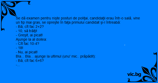 Se dă examen pentru nişte posturi de poliţai, candidaţii erau într-o sală, vine un tip mai gras, se opreşte în faţa primului candidat şi-l întreabă: