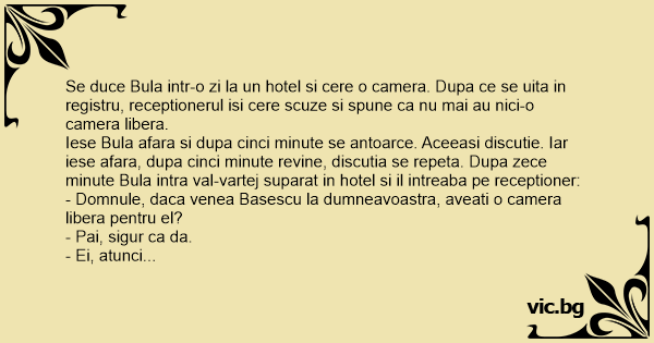 Se duce Bula intr-o zi la un hotel si cere o camera. Dupa ce se uita in registru, receptionerul isi cere scuze si spune ca nu mai au nici-o camera libera.