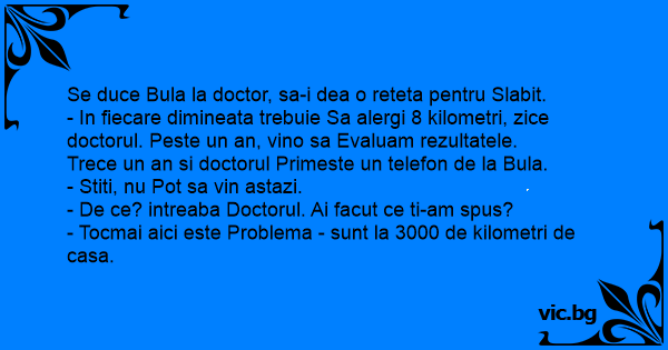 - In fiecare dimineata trebuie Sa alergi 8 kilometri, zice doctorul. Peste un an, vino sa Evaluam rezultatele.