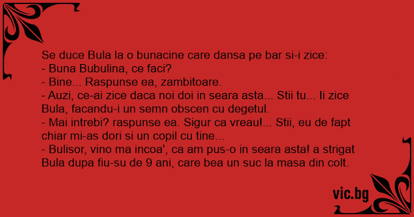 - Bulisor, vino ma incoa', ca am pus-o in seara asta! a strigat Bula dupa fiu-su de 9 ani, care bea un suc la masa din colt.