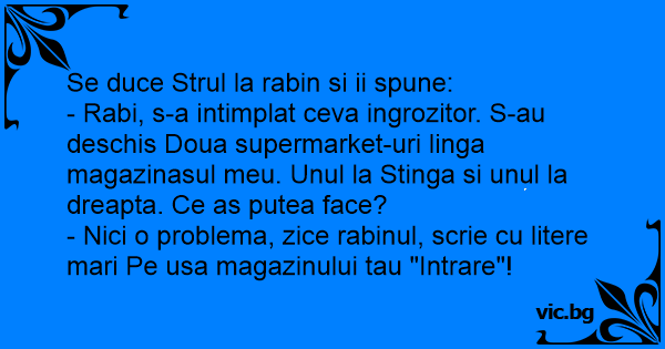 - Rabi, s-a intimplat ceva ingrozitor. S-au deschis Doua supermarket-uri linga magazinasul meu. Unul la Stinga si unul la dreapta. Ce as putea face?