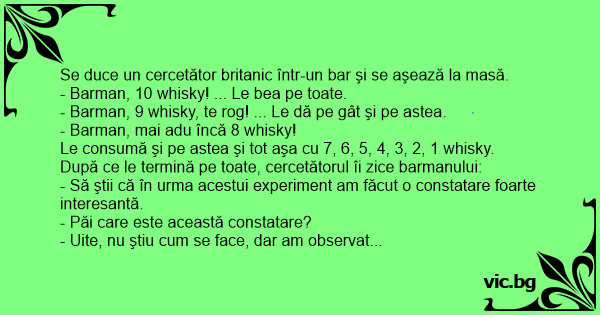 După ce le termină pe toate, cercetătorul îi zice barmanului: