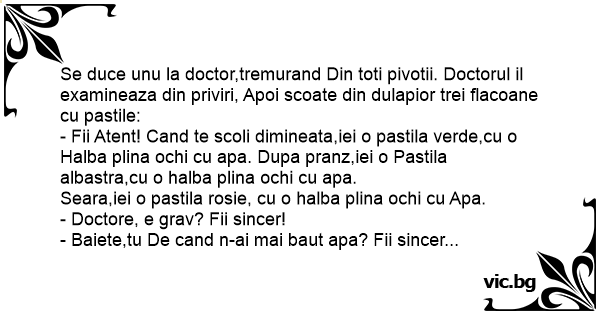 Se duce unu la doctor,tremurand Din toti pivotii. Doctorul il examineaza din priviri, Apoi scoate din dulapior trei flacoane cu pastile: