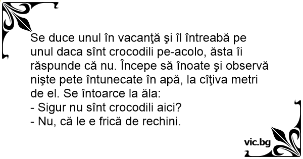 Se duce unul în vacanţă şi îl întreabă pe unul daca sînt crocodili pe-acolo, ăsta îi răspunde că nu. Începe să înoate şi observă nişte pete întunecate în apă, la cîţiva metri de el. Se întoarce la ăla:
