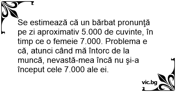 Se estimează că un bărbat pronunţă pe zi aproximativ 5.000 de cuvinte, în timp ce o femeie 7.000. Problema e că, atunci când mă întorc de la muncă, nevastă-mea încă nu şi-a început cele 7.000 ale ei.