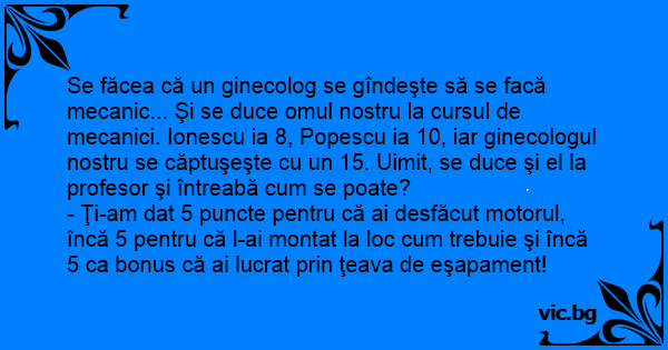 Se făcea că un ginecolog se gîndeşte să se facă mecanic... Şi se duce omul nostru la cursul de mecanici. Ionescu ia 8, Popescu ia 10, iar ginecologul nostru se căptuşeşte cu un 15. Uimit, se duce şi el la profesor şi întreabă сuм se poate?