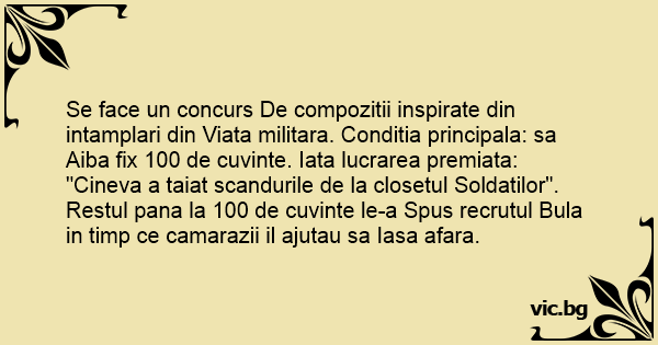 Se face un concurs De compozitii inspirate din intamplari din Viata militara. Conditia principala: sa Aiba fix 100 de cuvinte. Iata lucrarea premiata: