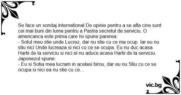 Se face un sondaj international De opinie pentru a se afla cine sunt cei mai buni din lume pentru a Pastra secretul de serviciu. O americanca este prima care Isi spune parerea:
