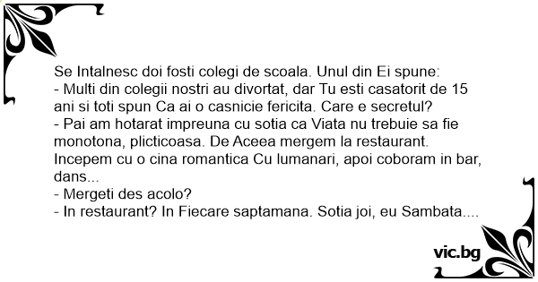 - Pai am hotarat impreuna cu sotia ca Viata nu trebuie sa fie monotona, plicticoasa. De Aceea mergem la restaurant. Incepem cu o cina romantica Cu lumanari, apoi coboram in bar, dans...