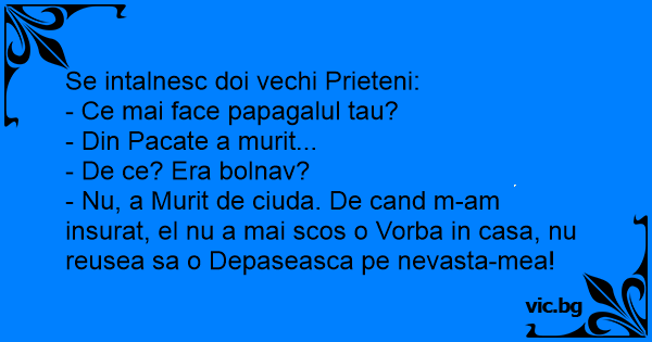 - Nu, a Murit de ciuda. De cand m-am insurat, el nu a mai scos o Vorba in casa, nu reusea sa o Depaseasca pe nevasta-mea!