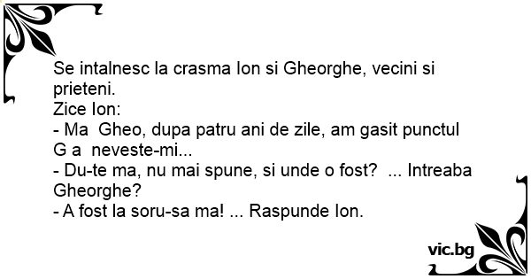 - Ma Gheo, dupa patru ani de zile, am gasit punctul G a neveste-mi...