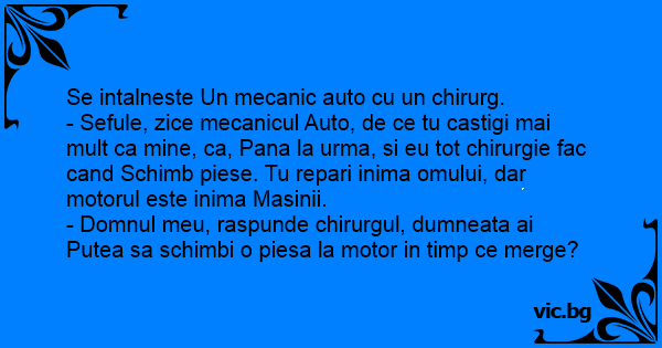 - Sefule, zice mecanicul Auto, de ce tu castigi mai mult ca mine, ca, Pana la urma, si eu tot chirurgie fac cand Schimb piese. Tu repari inima omului, dar motorul este inima Masinii.