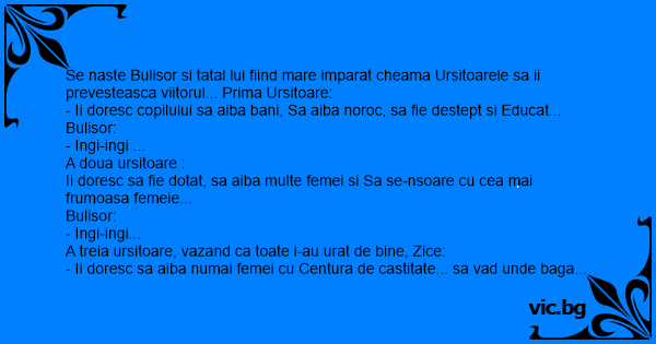Se naste Bulisor si tatal lui fiind mare imparat cheama Ursitoarele sa ii prevesteasca viitorul... Prima Ursitoare: - Ii doresc copilului sa aiba bani, Sa aiba noroc, sa fie destept si Educat... Bulisor: - Ingi-ingi ... A doua ursitoare : Ii doresc sa fie dotat, sa aiba multe femei si Sa se-nsoare cu cea mai frumoasa femeie... Bulisor: - Ingi-ingi... A treia ursitoare, vazand ca toate i-au urat de bine, Zice: - Ii doresc sa aiba numai femei cu Centura de castitate... sa vad unde baga Chestia aia mare... Bulisor: - In-g, In-g, in-gatu' ma-tii...