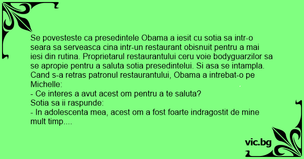 Se povesteste ca presedintele Obama a iesit cu sotia sa intr-o seara sa serveasca cina intr-un restaurant obisnuit pentru a mai iesi din rutina. Proprietarul restaurantului ceru voie bodyguarzilor sa se apropie pentru a saluta sotia presedintelui. Si asa se intampla. Cand s-a retras patronul restaurantului, Obama a intrebat-o pe Michelle: