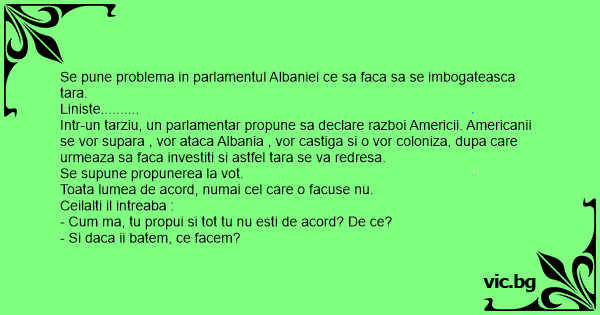 Intr-un tarziu, un parlamentar propune sa declare razboi Americii. Americanii se vor supara , vor ataca Albania , vor castiga si o vor coloniza, dupa care urmeaza sa faca investiti si astfel tara se va redresa.