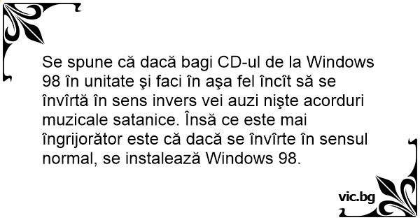Se spune că dacă bagi CD-ul de la Windows 98 în unitate şi faci în aşa fel încît să se învîrtă în sens invers vei auzi nişte acorduri muzicale satanice. Însă ce este mai îngrijorător este că dacă se învîrte în sensul normal, se instalează Windows 98.