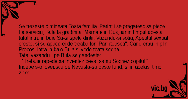 Se trezeste dimineata Toata familia. Parintii se pregatesc sa plece La serviciu, Bula la gradinita. Mama e in Dus, iar in timpul acesta tatal intra in baie Sa-si spele dintii. Vazandu-si sotia, Apetitul sеxuаl creste, si se apuca ei de treaba lor "Parinteasca". Cand erau in plin Proces, intra in baie Bula si vede toata scena.