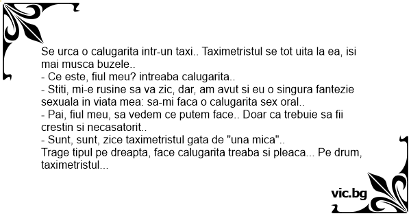 Trage tipul pe dreapta, face calugarita treaba si pleaca... Pe drum, taximetristul incepe sa planga: