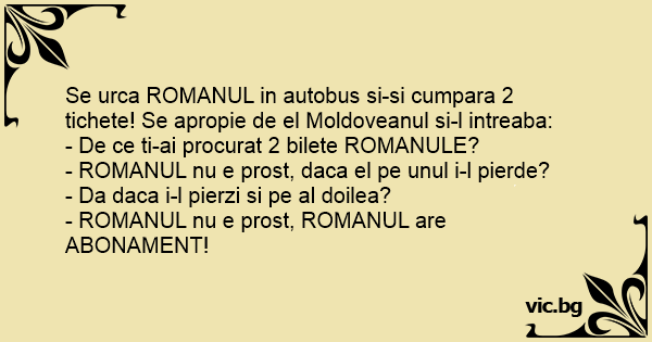 Se urca ROMANUL in autobus si-si cumpara 2 tichete! Se apropie de el Moldoveanul si-l intreaba: