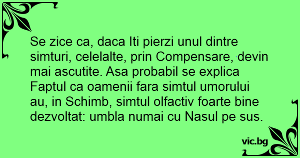 Se zice ca, daca Iti pierzi unul dintre simturi, celelalte, prin Compensare, devin mai ascutite. Asa probabil se explica Faptul ca oamenii fara simtul umorului au, in Schimb, simtul olfactiv foarte bine dezvoltat: umbla numai cu Nasul pe sus.