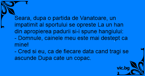 Seara, dupa o partida de Vanatoare, un impatimit al sportului se opreste La un han din apropierea padurii si-i spune hangiului: