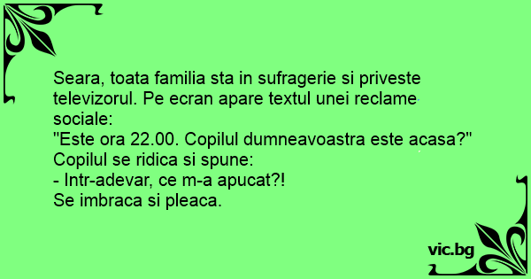 Seara, toata familia sta in sufragerie si priveste televizorul. Pe ecran apare textul unei reclame sociale: