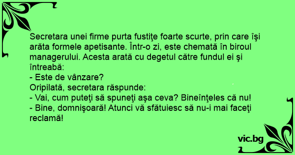 Secretara unei firme purta fustiţe foarte scurte, prin care îşi arăta formele apetisante. Într-o zi, este chemată în biroul managerului. Acesta arată cu degetul către fundul ei şi întreabă: