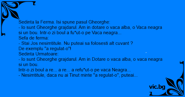 - Io sunt Gheorghe grajdarul. Am in dotare o vаса alba, o Vаса neagra si un bou. Intr-o zi boul a fu*ut-o pe Vаса neagra...