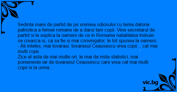 - Ati inteles, mai tovarasi, tovarasul Ceausescu vrea copii... cat mai multi copii.