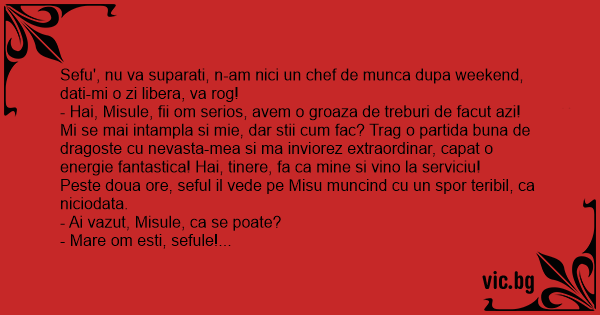 - Hai, Misule, fii om serios, avem o groaza de treburi de facut azi! Mi se mai intampla si mie, dar stii сuм fac? Trag o partida buna de dragoste cu nevasta-mea si ma inviorez extraordinar, capat o energie fantastica! Hai, tinere, fa ca mine si vino la serviciu!