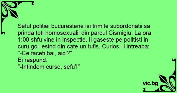 Seful politiei bucurestene isi trimite subordonatii sa prinda toti homosexualii din parcul Cismigiu. La ora 1:00 shfu vine in inspectie. Ii gaseste pe politisti in curu gol iesind din cate un tufis. Curios, ii intreaba: