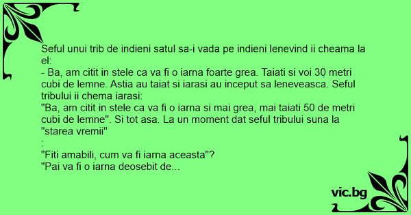 - Ba, am citit in stele ca va fi o iarna foarte grea. Taiati si voi 30 metri cubi de lemne. Astia au taiat si iarasi au inceput sa leneveasca. Seful tribului ii chema iarasi: