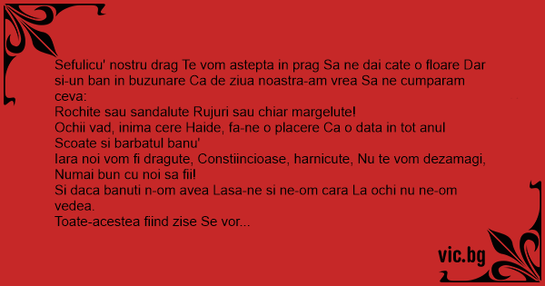 Sefulicu' nostru drag Te vom astepta in prag Sa ne dai cate o floare Dar si-un ban in buzunare Ca de ziua noastra-am vrea Sa ne cumparam ceva: