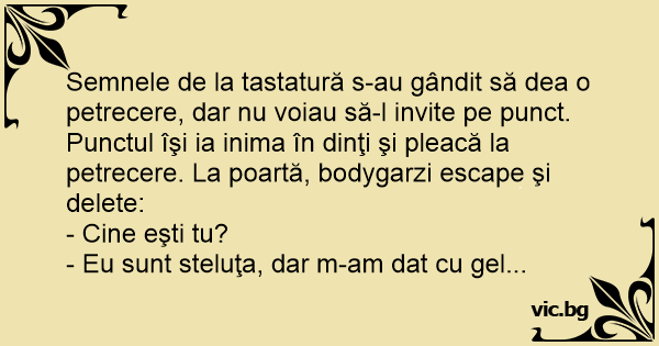 Semnele de la tastatură s-au gândit să dea o petrecere, dar nu voiau să-l invite pe punct. Punctul îşi ia inima în dinţi şi pleacă la petrecere. La poartă, bodygarzi escape şi delete: