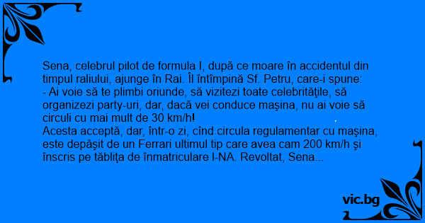 Acesta acceptă, dar, într-o zi, cînd circula regulamentar cu maşina, este depăşit de un Ferrari ultimul tip care avea cam 200 km/h şi înscris pe tăbliţa de înmatriculare l-NA. Revoltat, Sena se duce la Sf. Petru şi îi spune: