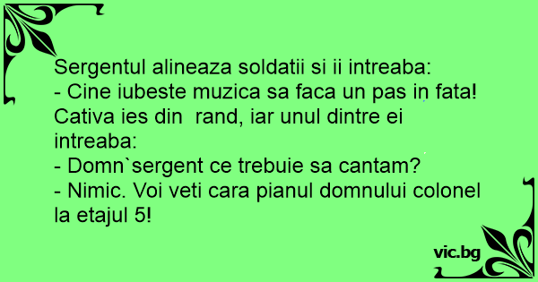 El sagento dice: - Dos soldados voluntarios que les guste la música... Dan un paso al frente dos soldados. - A ver, a bajar del quinto piso el piano de mi general.
