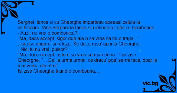 Serghei, Ianos si cu Gheorghe imparteau aceeasi celula la inchisoare. Vine Serghei la Ianos si-i intinde o cutie cu bomboane: