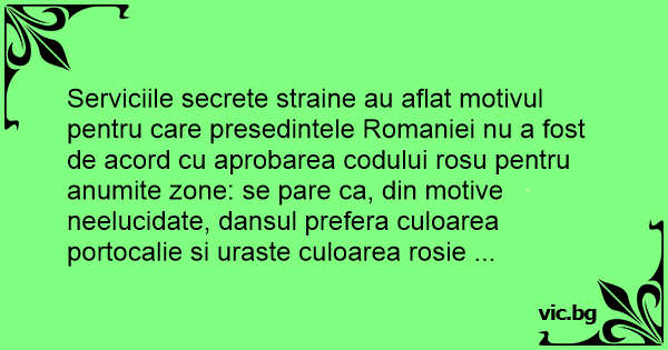 Serviciile secrete straine au aflat motivul pentru care presedintele Romaniei nu a fost de acord cu aprobarea codului rosu pentru anumite zone: se pare ca, din motive neelucidate, dansul prefera culoarea portocalie si uraste culoarea rosie ...