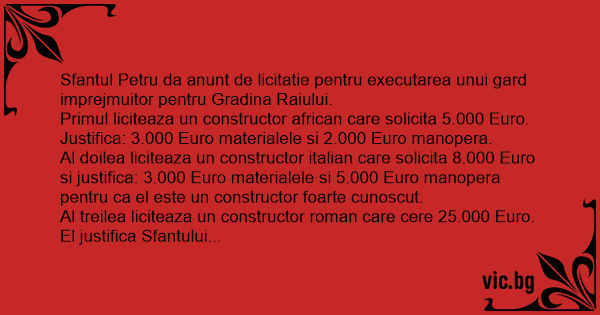 Sfantul Petru da anunt de licitatie pentru executarea unui gard imprejmuitor pentru Gradina Raiului.