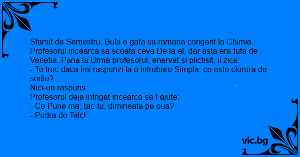 Sfarsit de Semestru. Bula e gata sa ramana corigent la Chimie... Profesorul incearca sa scoata ceva De la el, dar asta era tufa de Venetia. Pana la Urma profesorul, enervat si plictisit, ii zice: